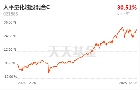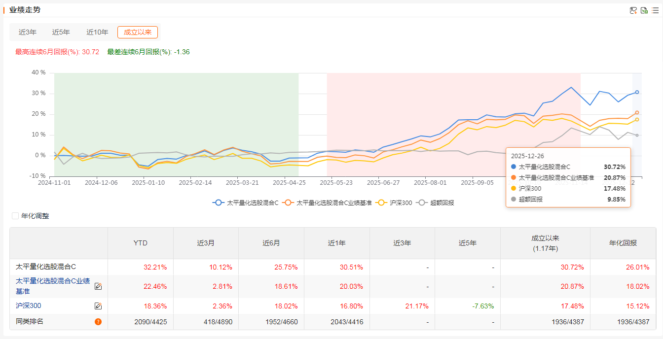 截至2025年12月25日,基金成立以来收益为30.72%,今年以来收益为30.51%,近一月收益为2.22%,近一年收益为31.39%。基金在震荡市场中表现出色,归因于其灵活的策略调整和量化模型的精准性。