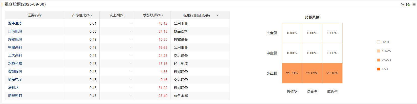 从持仓结构来看,截至2025年9月30日,太平量化选股混合A的股票仓位为79.46%,银行存款为20.45%。行业分布上,制造业占比高达52.13%,批发和零售业、水利环境公共设施管理业、信息技术服务业等占比相对较低。十大重仓股均为小市值公司,如冠中生态(0.61%)、日辰股份(0.50%)、鸿铭股份(0.49%)等,且近期贡献率为负,表明这些重仓股表现不佳。