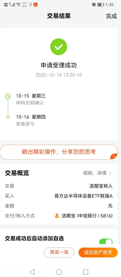 今天加仓$易方达半导体设备ETF联接A$ ,这个品种主要跟踪的是中证半导体材料设备主题指数,在昨天市场低迷的情况下,居然还能涨3.10%,资金流入信号比较明显,今天倒车接人再度回到启动点。我认为国产替代+自主可控是当下市场最需要发展的方向。加上半导体长期趋势依然向好,短期调整之后,估值性价比再度提升,现在正是比较好的潜伏时间窗,我再试一试好了。