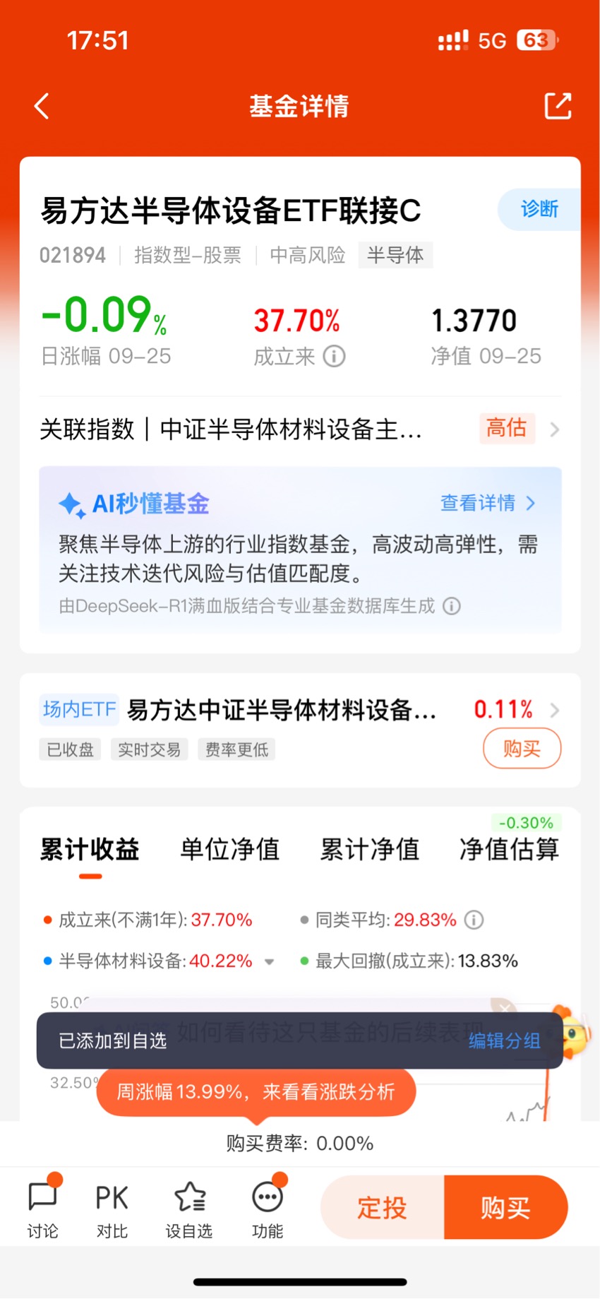 我关注易方达半导体设备ETF联接C,正因其优势贴合需求:一是覆盖全面,跟踪指数囊括半导体设备全产业链龙头,避免单一标的风险,像旅途中多路线备选更稳妥;二是费用划算,无申购费且持有7天免赎回费,短期持有成本低,适合灵活调整;三是门槛不高,10元就能参与,不用“凑路费”,普通人也能分享半导体国产替代红利。
