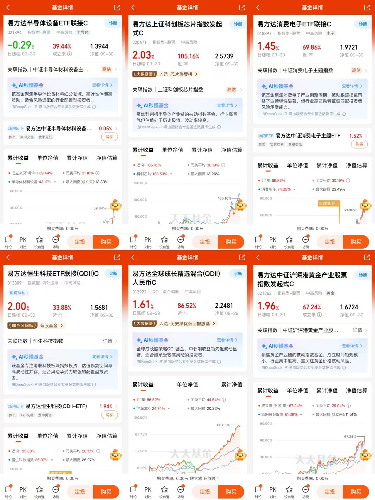 归根结底,就是我的仓位里配置最多的还是白酒、公共服务这样的价值股,而现在确实已经是科技股的天下。资本市场有一条重要的投资规律就是强者恒强。因此,在2025年的最后一个季度,我也会同样增加对于科技股的配置。当前国产人工智能智能爆发引领的“第四次工业革命”的增长潜力,而易方达人工智能和芯片指数基金堪称是公募基金代表者,未来如果逐渐将人工智能应用于工业生产或者是服务企业中,对公领域比如AIGC预计将实现百倍乃至千倍的指数级增长,同样的芯片产业也有望受益。而借助易方达基金的宝藏科技系列基金——明星基金经理李树建先生的易方达半导体设备ETF联接(A:021893;C:021894)、李栩先生的易方达上证科创板芯片指数发起式(A:020670;C:020671)、李博扬先生的易方达消费电子ETF联接(A:018896;C:018897)、刘依姗女士的易方达恒生科技ETF联接(QDII)(A:013308;C:013309)、郑希先生的易方达全球成长精选混合(QDII)人民币(A:012920;C:012922)、李树建先生的易方达中证沪深港黄金产业股票指数发起式(A:021362;C:021363)、李树建先生的易方达机器人ETF联接(A:020972;C:020973)张湛先生的易方达中证人工智能主题ETF联接(A:012733;C:012734)、郑希先生的易方达信息产业混合(A:001513;C:019018)等,获取人工智能、芯片等赛道的高弹性机会。