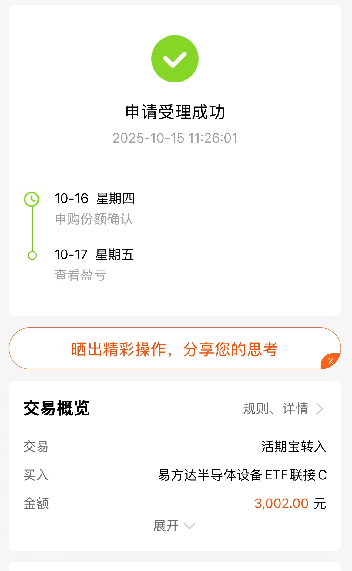 今天A股市场小幅高开后震荡走高,开始展开反弹修复行情啦,科技、创新药等板块反弹。不过最近的黑天鹅事件导致半导体板块下跌调整,但我相信很快可能补涨的。三星电子业绩超预期、OpenAI 与多家企业合作、存储芯片价格上涨等等利好挺多。近期的稀土管制加速国产替代之下,我继续看好半导体赛道长期价值。$易方达半导体设备ETF联接C(OTCFUND|021894)$ ,近三个月38.10%的业绩涨幅也是比较优秀的,今日打算逢低补仓起来,期待后市反弹啦。