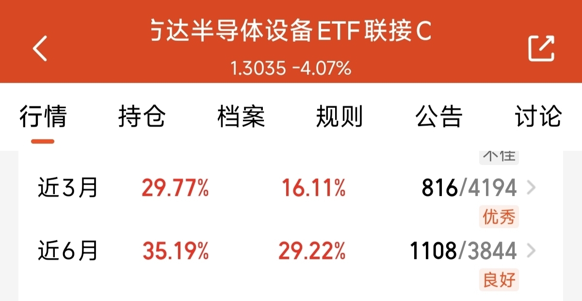 $易方达半导体设备ETF联接C$ 这只聚焦半导体上中游产业链的指数基金。紧跟中证半导体设备指数。全面覆盖了半导体上中游产业链。长期表现的一直不错。金3月上涨了29.77%。近6月上涨了35.19%。都是大幅跑赢同类平均业绩。而且采用指数化的投资。 不但费率比较低,而且遇到波动回撤控制也比较好。目前半导体设备整体对比芯片没怎么涨。所以未来爆发起来的空间大,我也开始布局了。