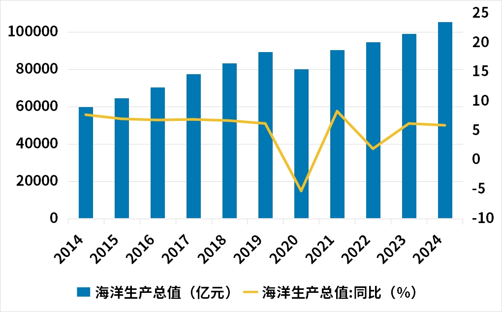 在过去,海洋经济逐年发展。截至2024年,我国海洋生产总值已突破10万亿元,比上年增长5.9%,增速比国内生产总值高0.9个百分点,占国内生产总值比重为7.8%。(来源:2024 年中国海洋经济统计公报)