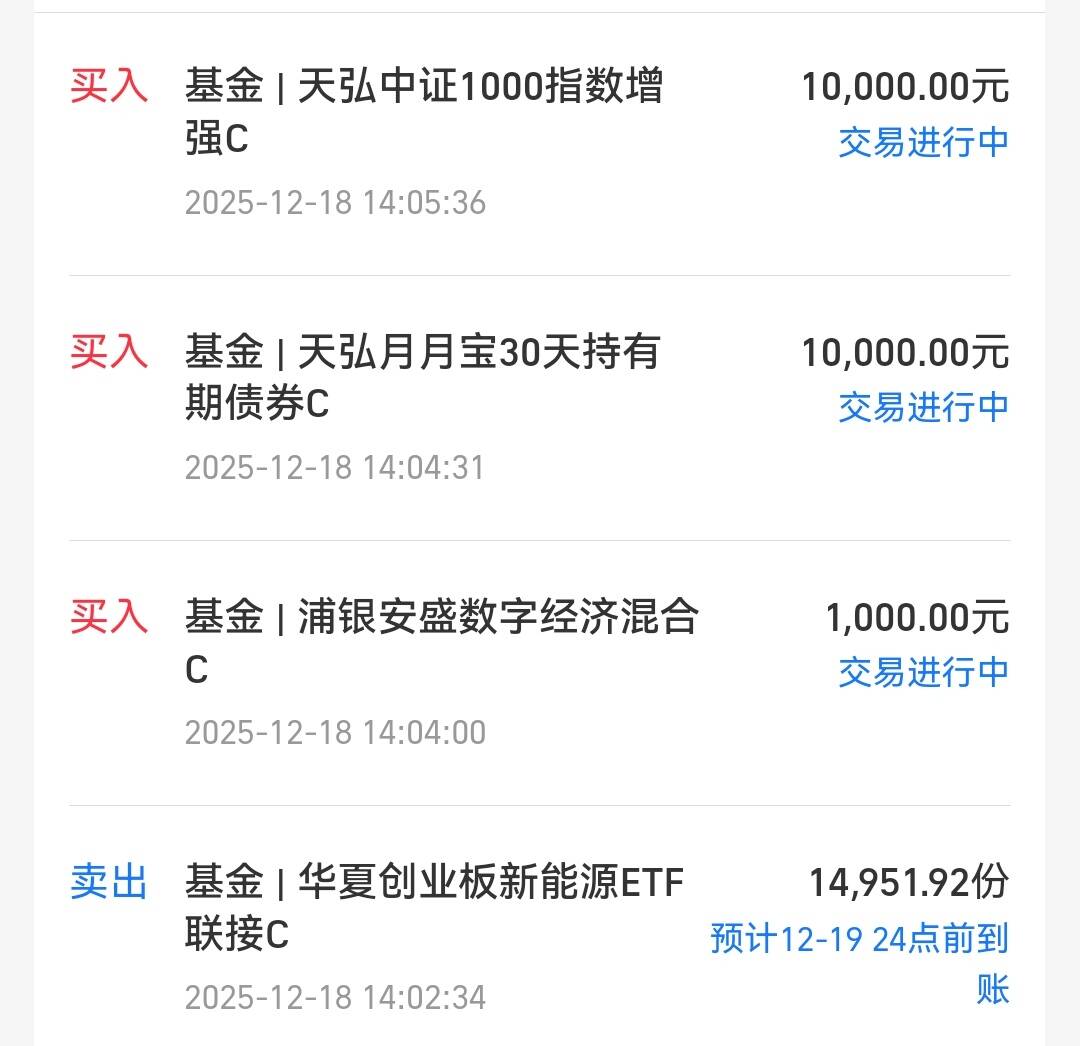 我今天加仓了半导体、中证1000指数、恒生互联网科技、天弘月月宝30天、浦银安盛数字经济,卖出一只基金,其它基金继续持有不动。