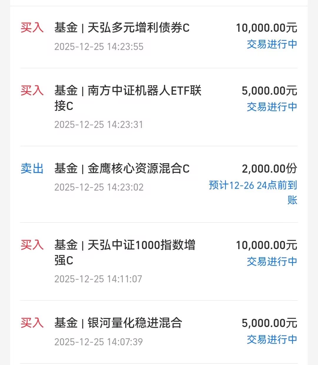 我今天加仓了半导体设备、机器人、天弘多元增利、中证1000、银河量化稳进,减仓两只基金,其它基金继续持有待涨。