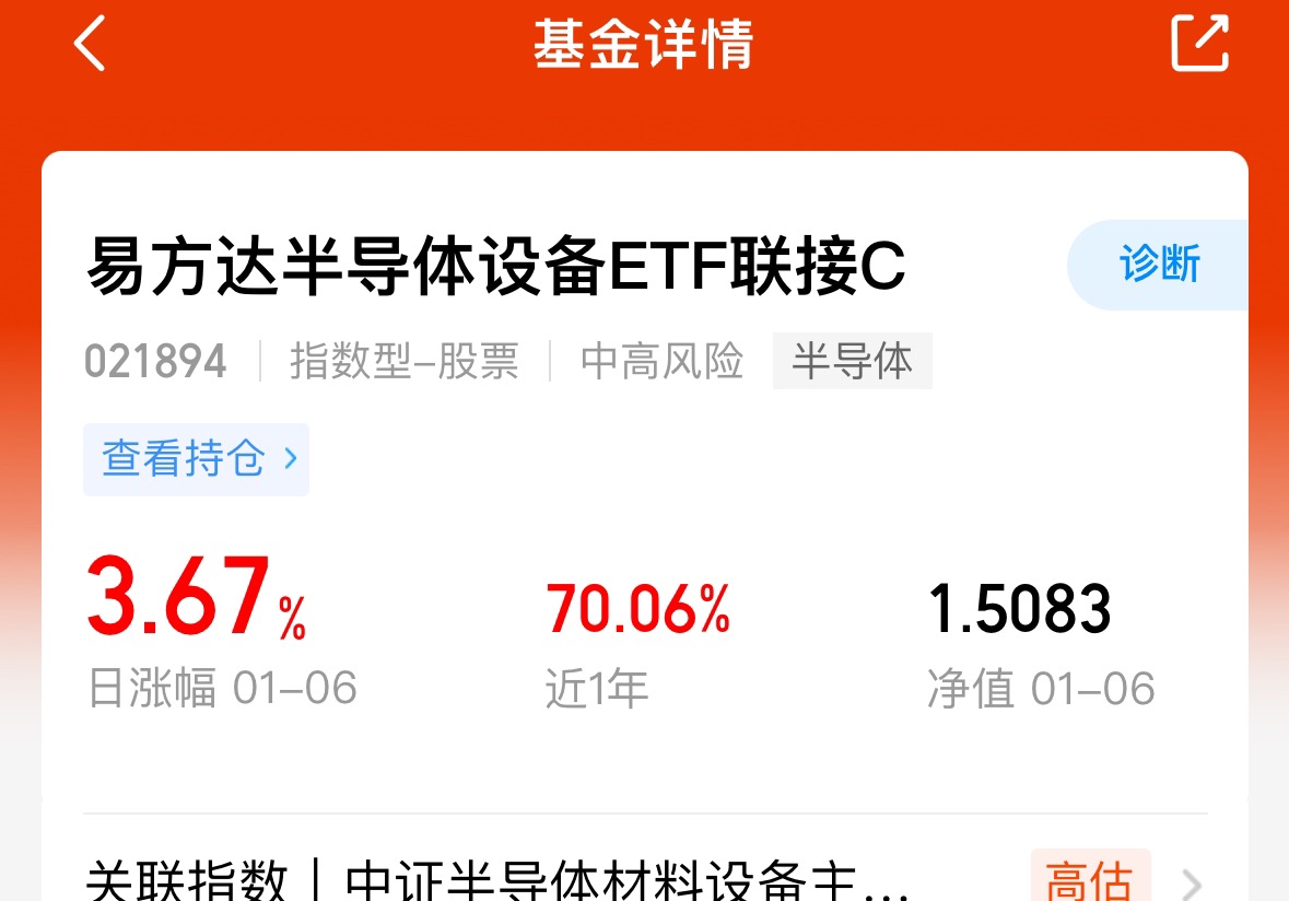易方达中证半导体材料设备主题ETF联接C主要专注上游设备与材料,这一轮行情尤其在半导体设备,AI算力、GPU、智能驾驶等终端场景布局更深。所以半导体设备仍然是有非常大的资金容纳空间,目前一年已经涨了70.06%,,昨天也有3.67%,表现优于同类均值。很给力