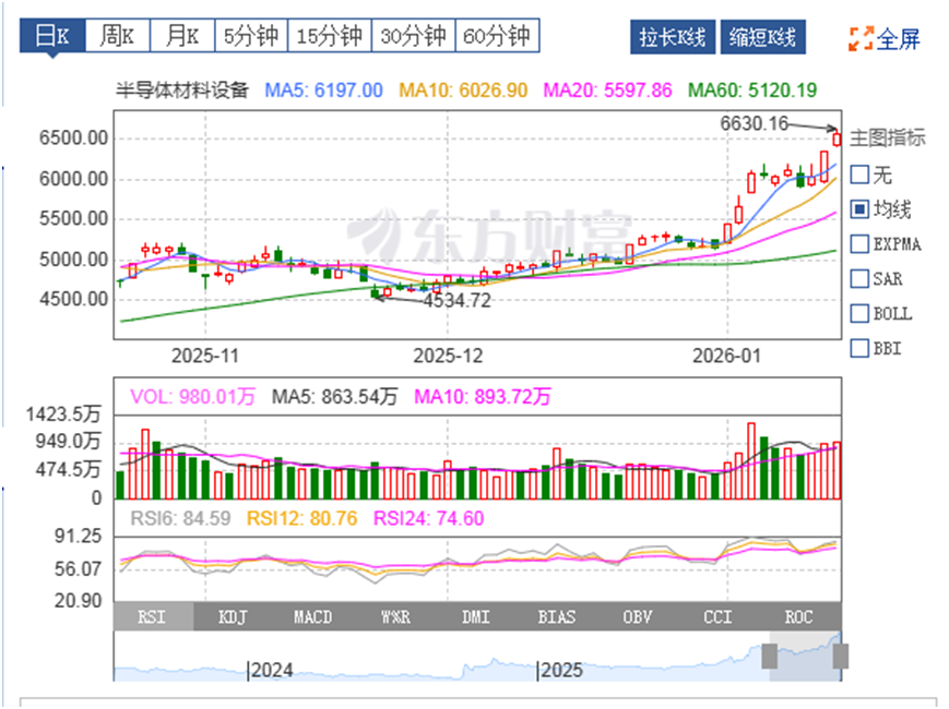 今天沪深两市虽然走势偏震荡,但半导体板块继续放量大涨,半导体材料设备指数盘中一度上涨超过3%,继续往上创底部上涨以来的新高,目前明显处于强势上涨趋势之中,我认为上涨行情还会持续较长一段时间。