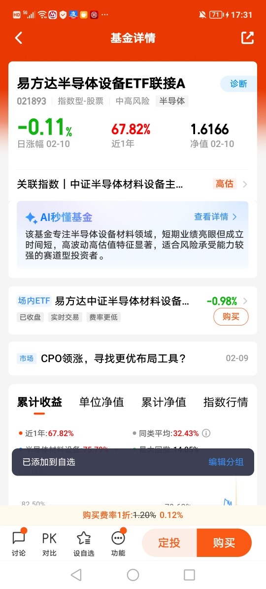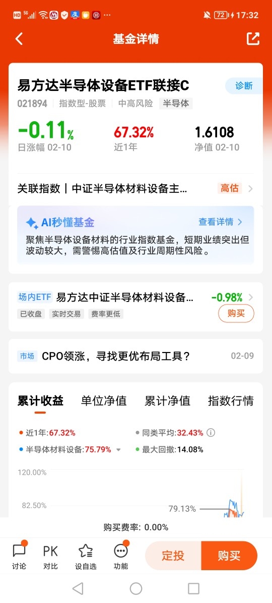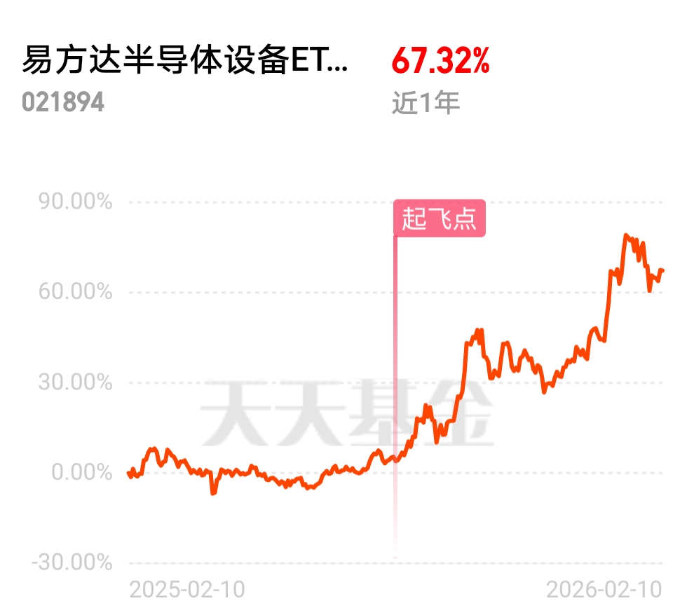 从24年开始市场走强,大部分的时间都在围绕AI叙事,AI产业的发展带动上中下游产业,其中半导体设备是芯片的上游产业,AI对芯片的需求,推动了芯片企业加大生产,需要有更多的半导体设备,所以给半导体设备也带来了机遇,从走势图中标注的起飞点不难看出,半导体设备的强劲爆发力,相比芯片只在其之上,春节之前我操作打算躺平,等春节之后逢低买入,持续关注。@易方达基金