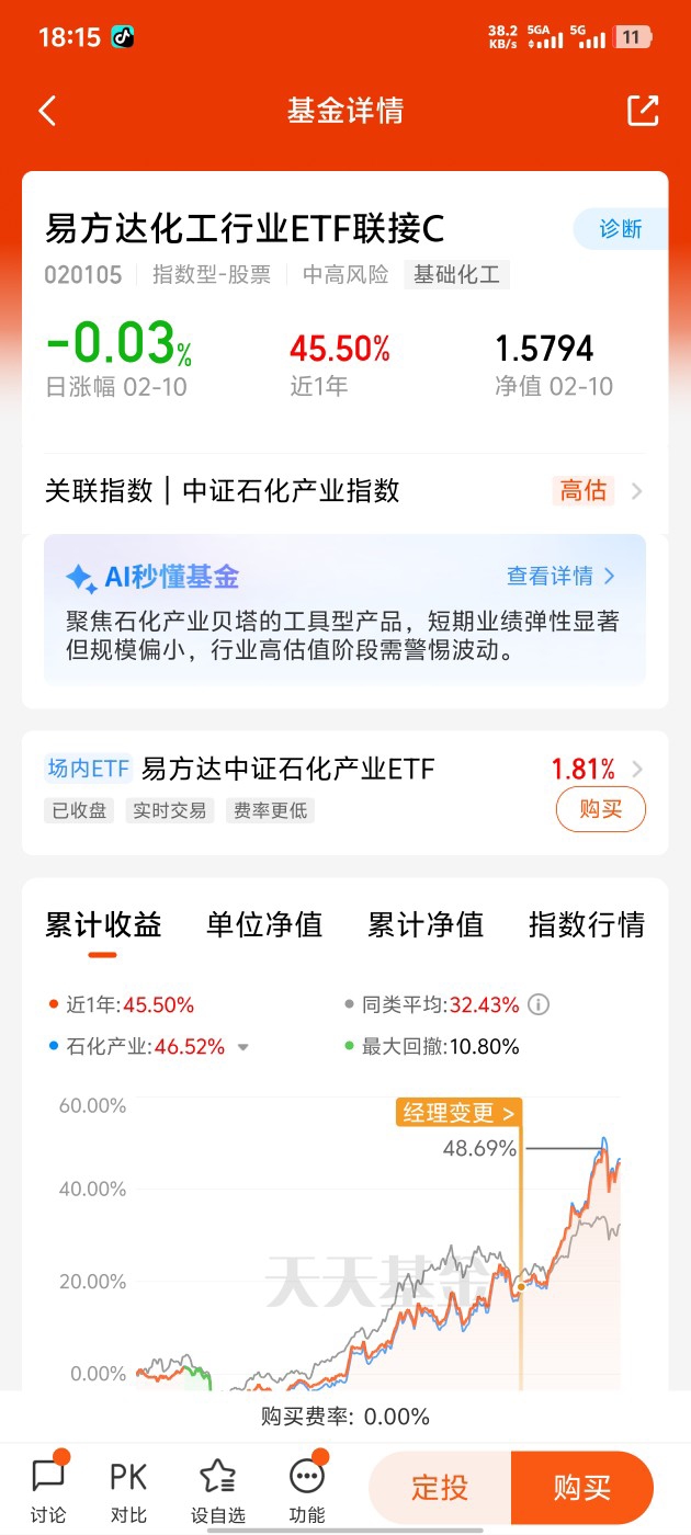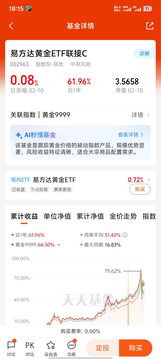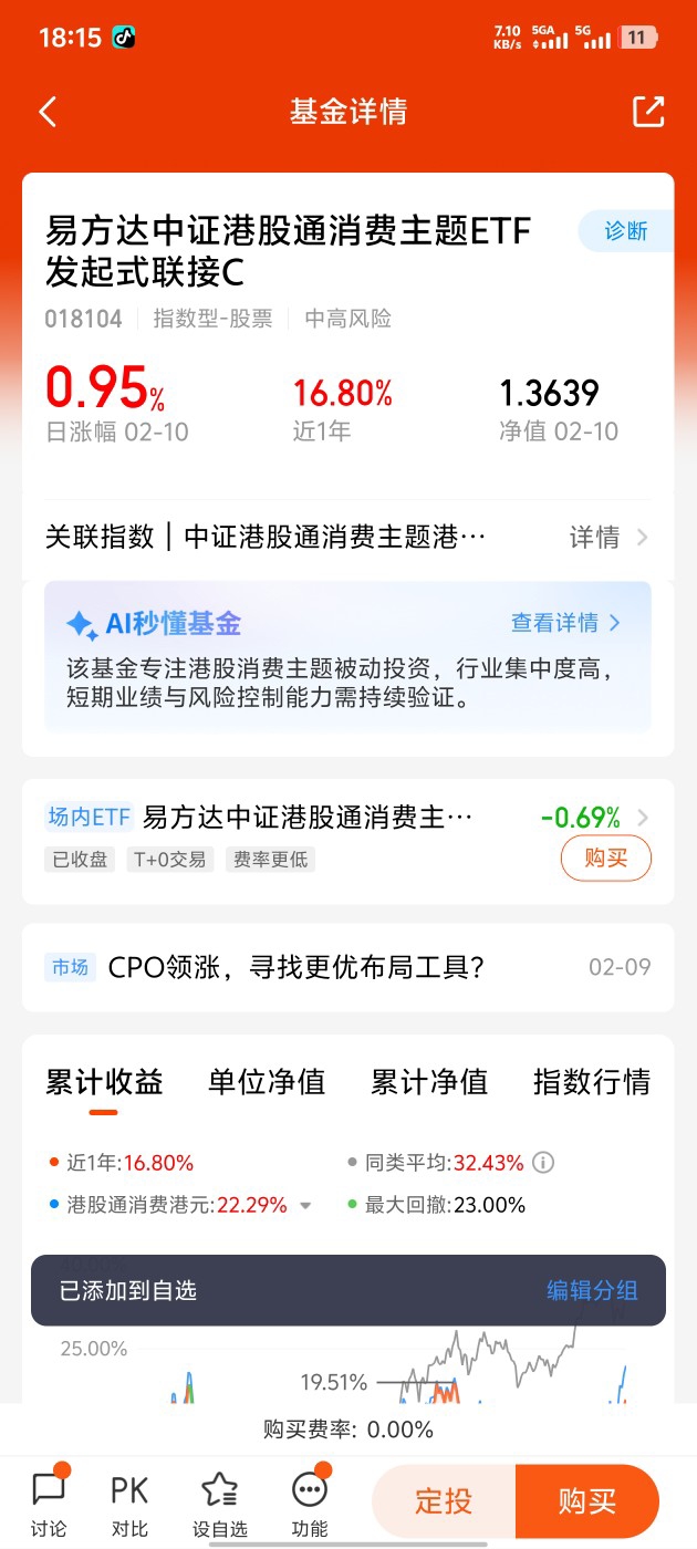 第二,联接C类份额0申购费,适合波段操作。 节后我预判行情会有反复,不会一把梭,而是分批布局。C类持有超过7天赎回费率很低,进可攻、退可守,不像股票型基金动辄套牢。
