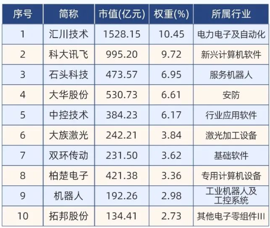 从个股来看,前十大权重股包括汇川技术、科大讯飞、石头科技、大华股份、中控技术、大族激光、双环传动、柏楚电子、机器人、拓邦股份等,前十大权重合计为56.43%,集中度比较高。