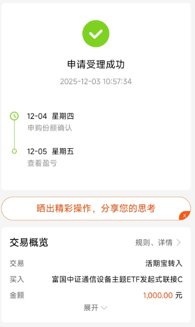 我根据“股票找基金”的方式,发现富国中证通信设备主题ETF发起式联接C(021934),是全市场中际旭创、中兴通讯持仓最高的基金,最近7个交易日净值连续飘红(2025.11.24至12.2)。我决定不错过这个趋势性机会,加仓一笔$富国中证通信设备主题ETF发起式联接C(OTCFUND|021934)$。