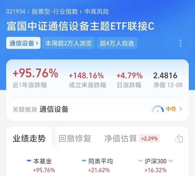 行情回落,A股三大指数涨跌不一,今天我也是加仓了$富国中证通信设备主题ETF发起式联接C$ +1000元,基金目前估值上涨了2.34%,今晚吃肉。近一个月上涨了11.18%,近6个月上涨了99.36%,盈利能力强。基金精准的跟踪,通信设备主题指数,综合费率低。目前通信设备板块正处于高景气度周期,多只龙头股强势上涨。随着AI算力需求的爆发、卫星通信等崛起。资金+政策利好,形成双轮驱动,将迎来新一轮的上行周期,长期持有,投资回报率高,期待后期收益。