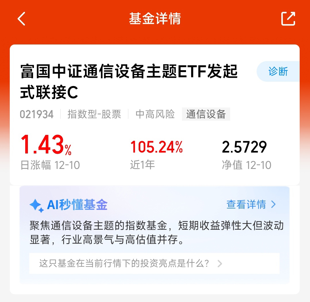 今日股市结构性分化显著:沪指走势相对疲软,而深证成指与创业板指则同步上行。行业板块方面,电池、新能源及电网设备成为市场领涨主力。$博时中证全指通信设备指数发起式C$ 持仓结构清晰,该基金约94.66%的资产直接配置于对应的富国中证通信设备主题ETF,从而实现对标的指数的紧密追踪。近期表现尤为亮眼,昨日净值上涨1.43%,近13个交易日中已有12天收获正收益。拉长时间看,其近一月、近三月、近一年的涨幅分别达到15.99%、23.52%和105.24%,呈现稳健上扬态势。今日市场震荡继续布局,期待好的收益。
