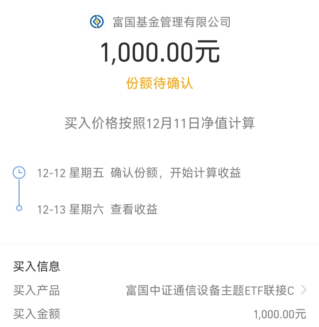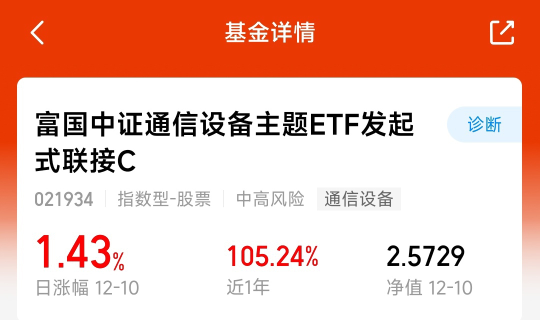 市场再现分化行情,沪指表现偏弱,深证成指与创业板指则携手走高。盘面上,电池、新能源、电网设备等板块涨幅居前。$富国中证通信设备主题ETF发起式联接C$ ,该基金持仓结构简明高效,94.66%的资产直接投向目标ETF,确保紧密跟踪通信设备指数走势。业绩表现方面,不仅昨日净值增长1.43%,更在最近13天内实现12日正收益,短中期表现持续强劲。从历史数据看,近一月上涨15.99%,近三月累计23.52%,近一年涨幅高达105.24%,整体保持稳步上升趋势。当前市场波动,我选择适当布局1000元。