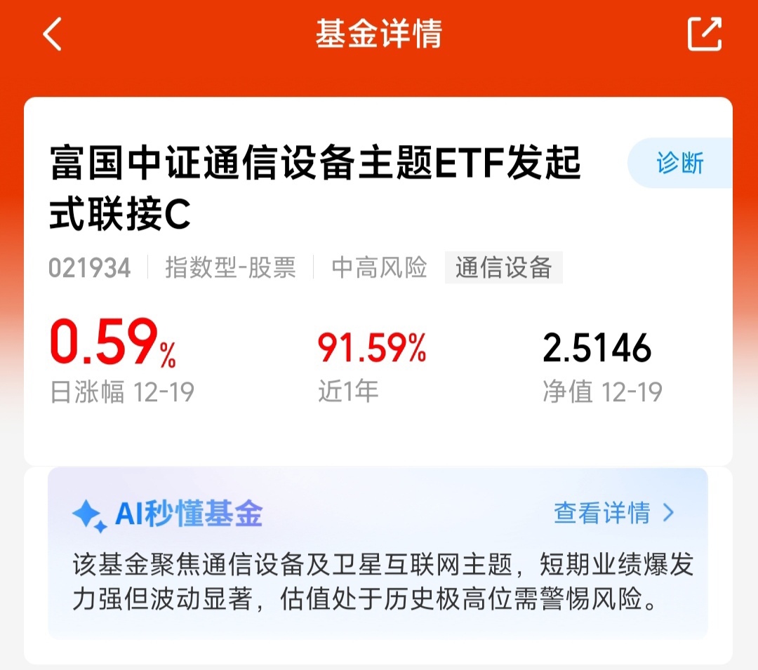 在此行情带动下,$富国中证通信设备主题ETF发起式联接C$ 紧密跟踪通信设备恢块,今日估值上涨3.61%,昨日涨幅为0.59%,近一年累计上涨91.5 9%,在同类产品中表现出较强的竞争力。