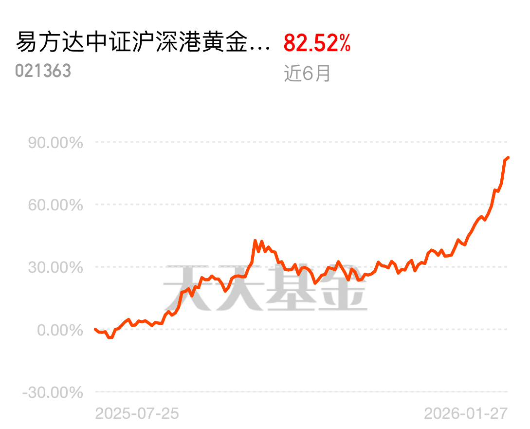 易方达黄金股基金表现太亮眼,易方达中证沪深港黄金产业股票指数发起式 C 近 6 月 82.52% 涨不停,布局金银 + 有色,黄金股不限购,黄金股本就比黄金弹性高,这只涨幅还能再创新高$易方达中证沪深港黄金产业股票指数发起式C$