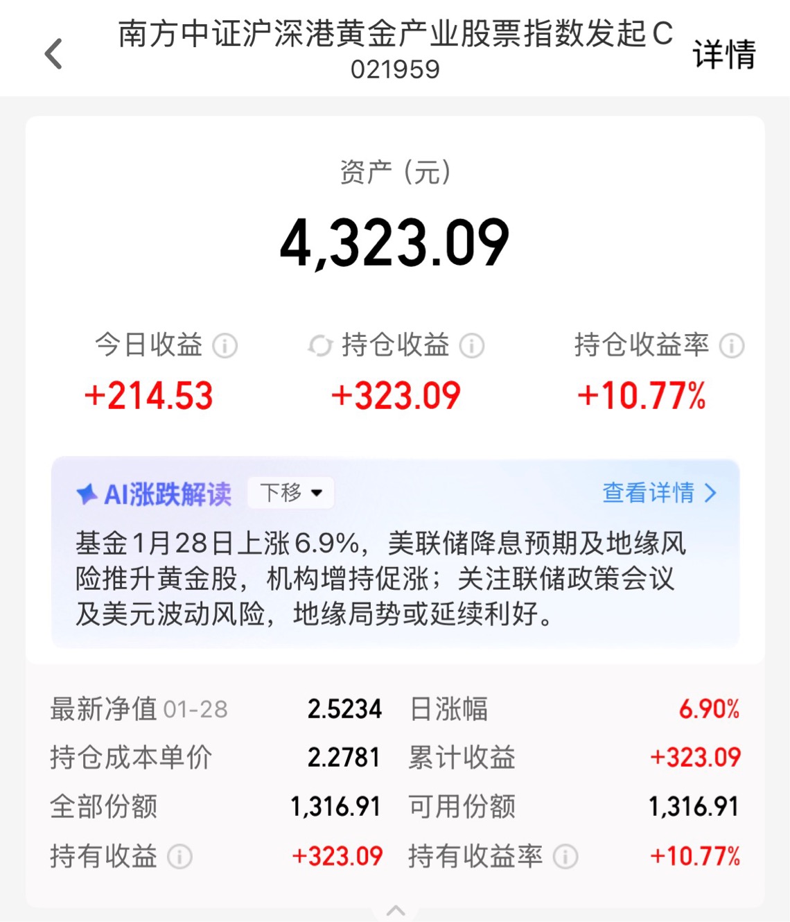黄金再创新高。目前持仓的$南方中证沪深港黄金产业股票指数发起C$ 今日上涨6.9%,太强了,我目前也是看好贵金属的发展趋势,我认为依旧具备投资价值,我考虑合理布局,期待中长期行情,目前临近春节,依旧具备热点趋势。而且随着美联储降息预期升温,持仓黄金的成本降低,也是利好黄金发展。目前高盛也是看好黄金的走势,随着全球央行持续购金,我认为黄金上行趋势依旧可以看好。目前我也是继续持仓待涨。