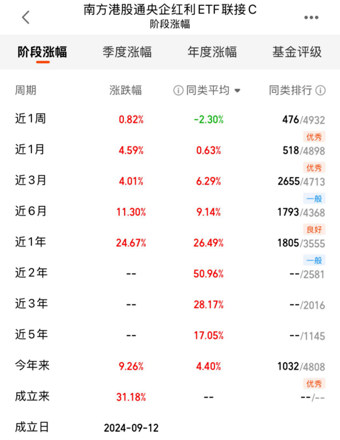 避险需求升温,再叠加低利率和“资产荒”的大背景,高股息红利资产的性价比只会越来越突出。聊到具体怎么布局,给大家说个可以直接上手的工具,就是 $南方港股通央企红利ETF联接C(OTCFUND|021972)$(021972)。这只基金专门布局港股市场里分红长期稳定的央企龙头,本身估值处于低位,面对市场震荡的抗波动能力突出,和当下的市场风格适配度极高。哪怕是近期的震荡行情里,它依旧保持了稳健的表现,截至最新数据,近1周反弹上涨0.82%,近1月上涨4.59%,近3月上涨4.01%,近6月上涨11.30%,近1年上涨24.67%,自成立以来累计收益达到31.18%。
