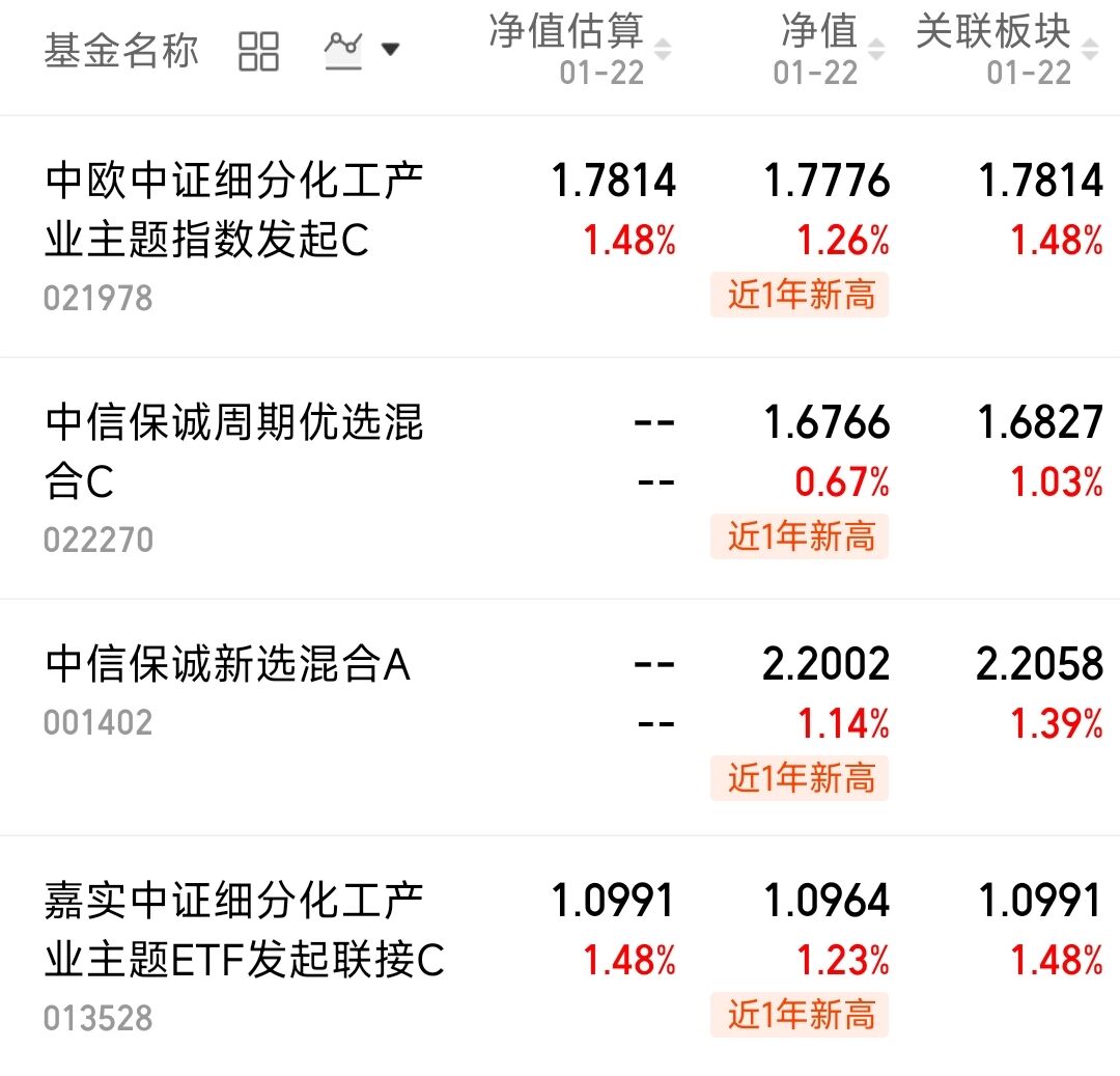机构反复提及油价低估逻辑,叠加欧美寒潮推涨天然气价格,油气方向或走趋势。洲际油气、中国一重等低价资源股涨停,契合当下 “避高就低” 的市场偏好,化工产业也随之被带动走强。中欧中证新分化工产业上涨1.26%,$中信保诚周期优选混合C(OTCFUND|022270)$上涨0.67%,$中信保诚新选混合A(OTCFUND|001402)$上涨1.14%,$嘉实中证细分化工产业主题ETF发起联接C(OTCFUND|013528)$上涨1.23%。