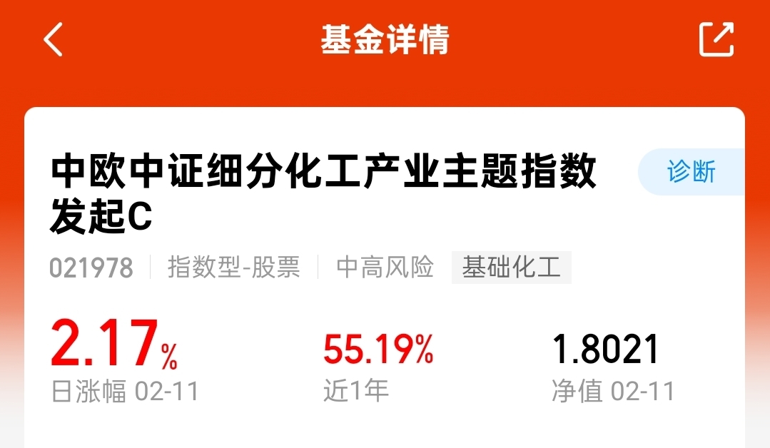 $中欧中证细分化工产业主题指数发起C$,涨2.17%,近一年涨幅超55%,持仓以