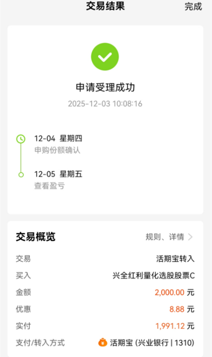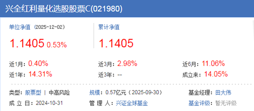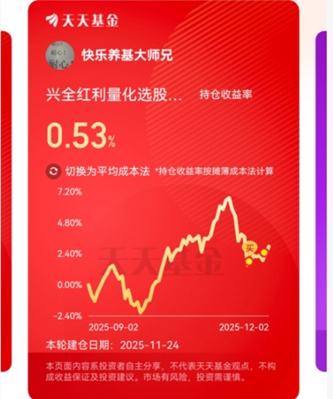 2025年12月2日,各大指数全跌,我最近建仓的兴证全球红利量化选股股票C(021980),竟然上涨了0.53%,涨幅领先于我持仓的其他各红利指数,惊喜满满。