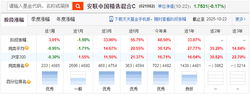 $安联中国精选混合C(OTCFUND|021982)$ 成立于2024年9月3日,截止2025年10月22日的收益率是:75.31%,完美的赶上了这一轮科技成长的大行情,基金看好人工智能发展带来的广泛而深远的投资机会,包括国内与海外,软件与硬件,A股与港股。