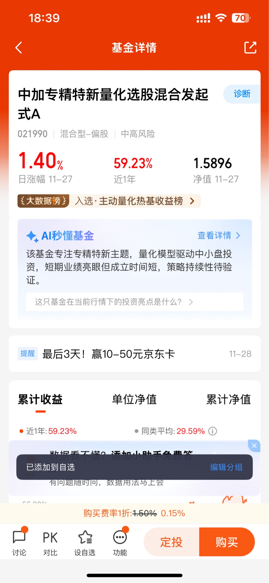 进入二季度,专精特新赛道迎来政策与业绩的双重催化。随着国家对中小企业创新支持力度加大、产业链补短板需求提升,基金持仓的多家企业业绩超预期增长,量化模型也及时捕捉到板块景气度变化,适度提升了高成长因子权重。基金净值随之稳步攀升,截至11月,今年以来收益率达29.7%,近6个月涨幅23.2%,最大回撤仅4.1%,远低于同类成长型基金平均水平,我的持仓收益率也顺利突破22%。这种“涨得多、跌得少”的表现,正是量化投资在风险控制与收益获取上的优势体现。