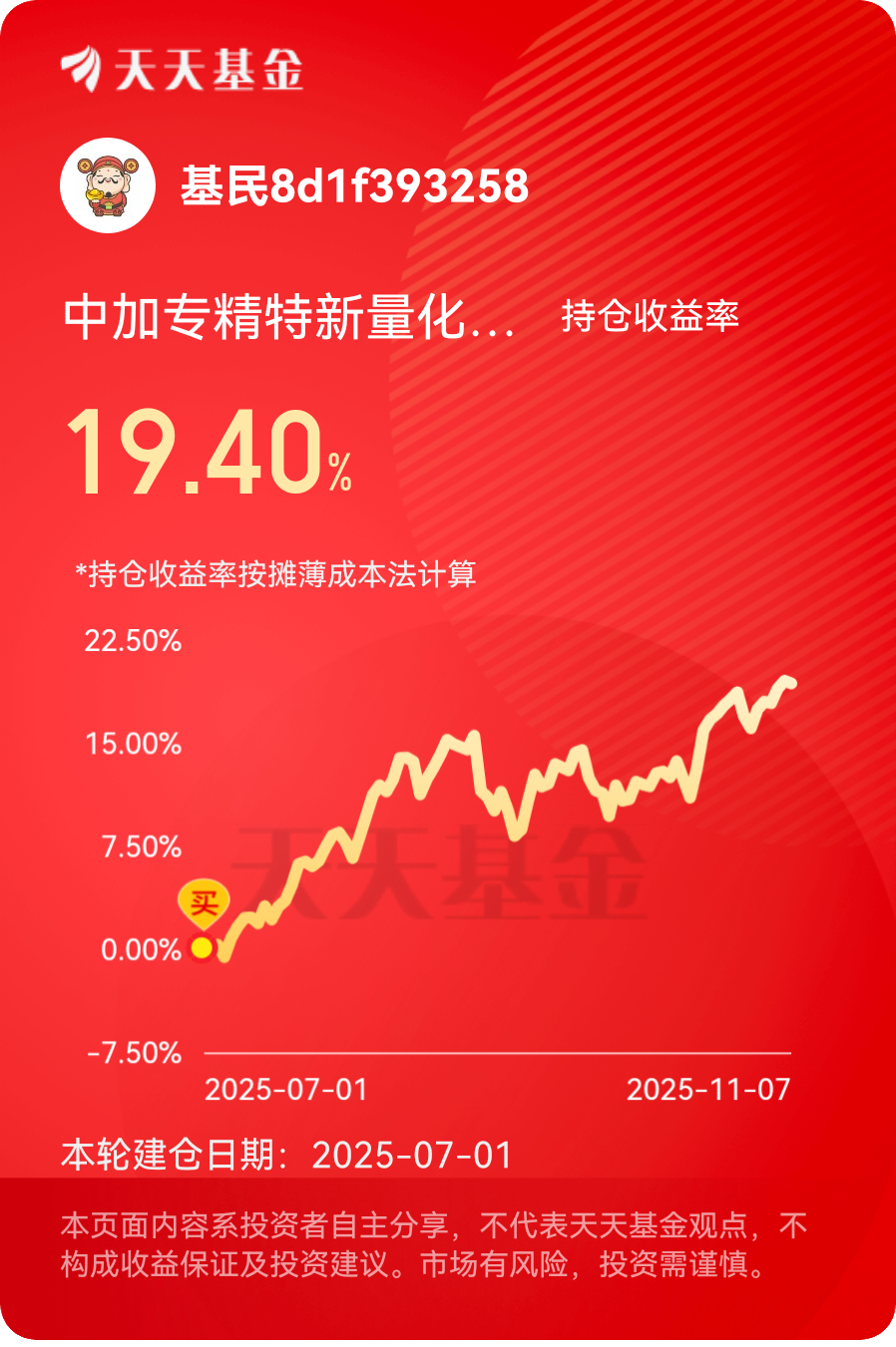 沪指站上4000点附近,科技前沿赛道的“小登资产”成为市场最靓的仔,而我作为$中加专精特新量化选股混合发起式C$的持有人,在众多优质标的中,始终坚定选择这只基金,它不仅给我带来了满意的收益,更用舒适的投资体验证明了自身价值,未来我会继续长期持有、择时加仓,也想把这份靠谱的投资选择分享给更多朋友。