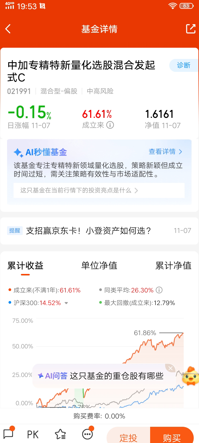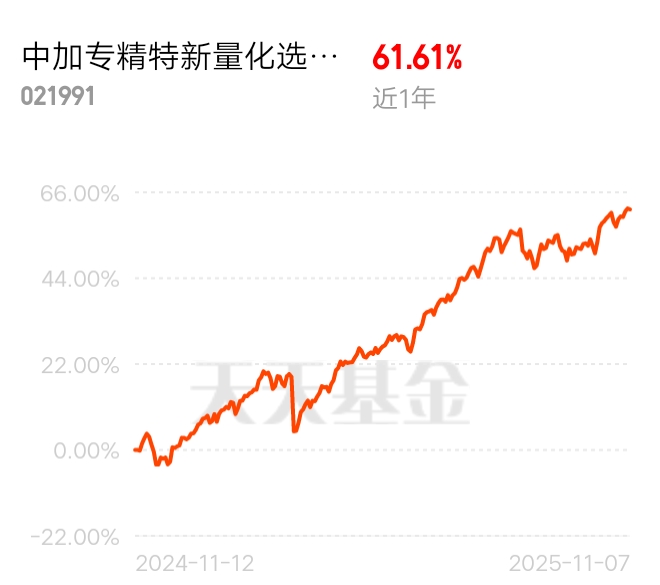 我选择$中加专精特新量化选股混合发起式C$,该基金聚焦投资工信部发布的“专精特新” 企业,小盘量化叠加科创属性双重BUFF,以中波弹性跟上牛市“小盘”和“科技”两大主线,该基金成立于2024年11月12日,至今上涨61.61%,今年以来已上涨62.32%。$中加专精特新量化选股混合发起式C$ @中加基金