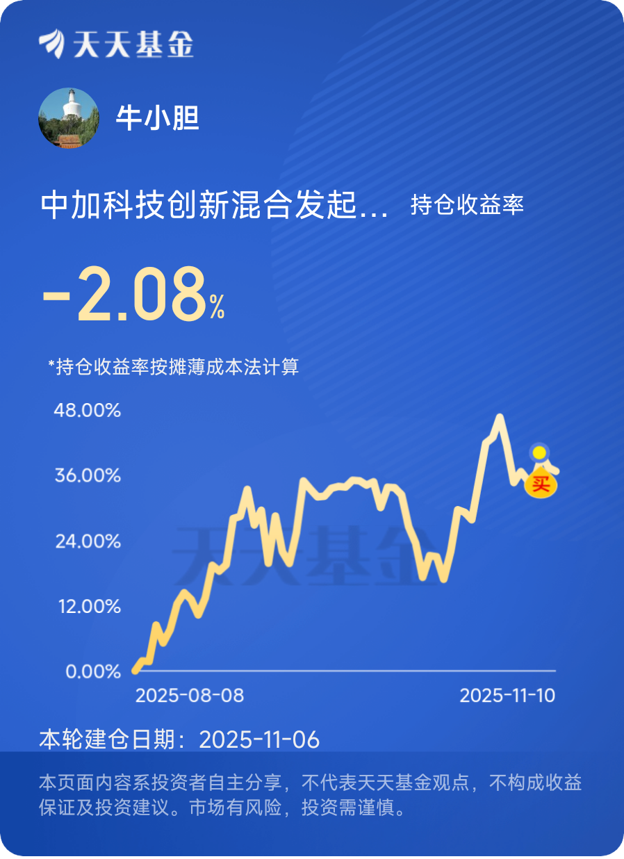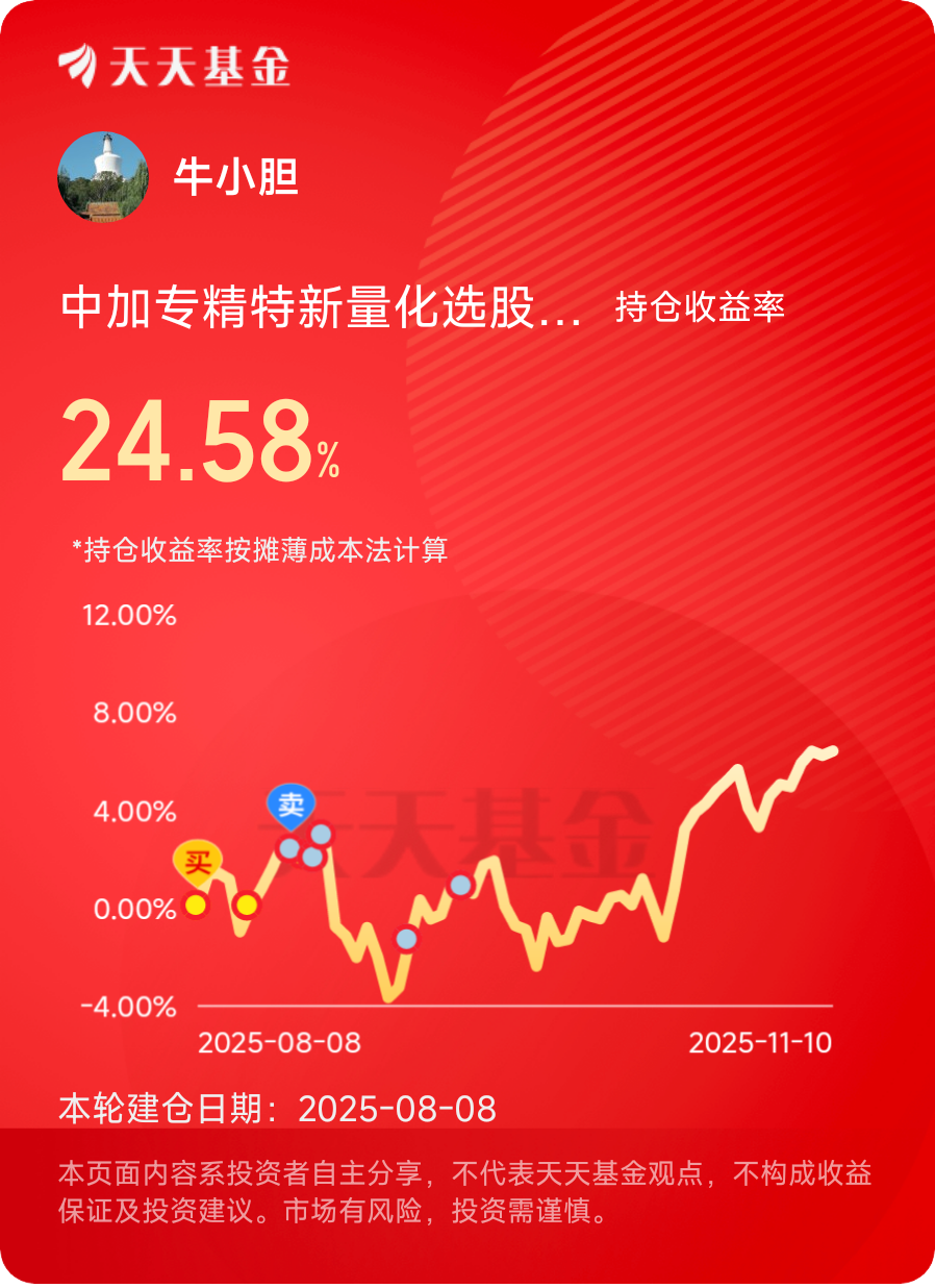 我选择的中加专精特新量化选股混合发起式C和中加科技创新混合发起式C,一个稳健打底,一个弹性提升,正好契合我的投资需求。后续我也会继续持有并关注,根据市场变化调整仓位。如果你也想布局“小登资产”,不妨参考我的思路,根据自己的风险承受能力选择适合的标的——毕竟只有选对了,才能在这波热度中真正赚到钱。@中加基金