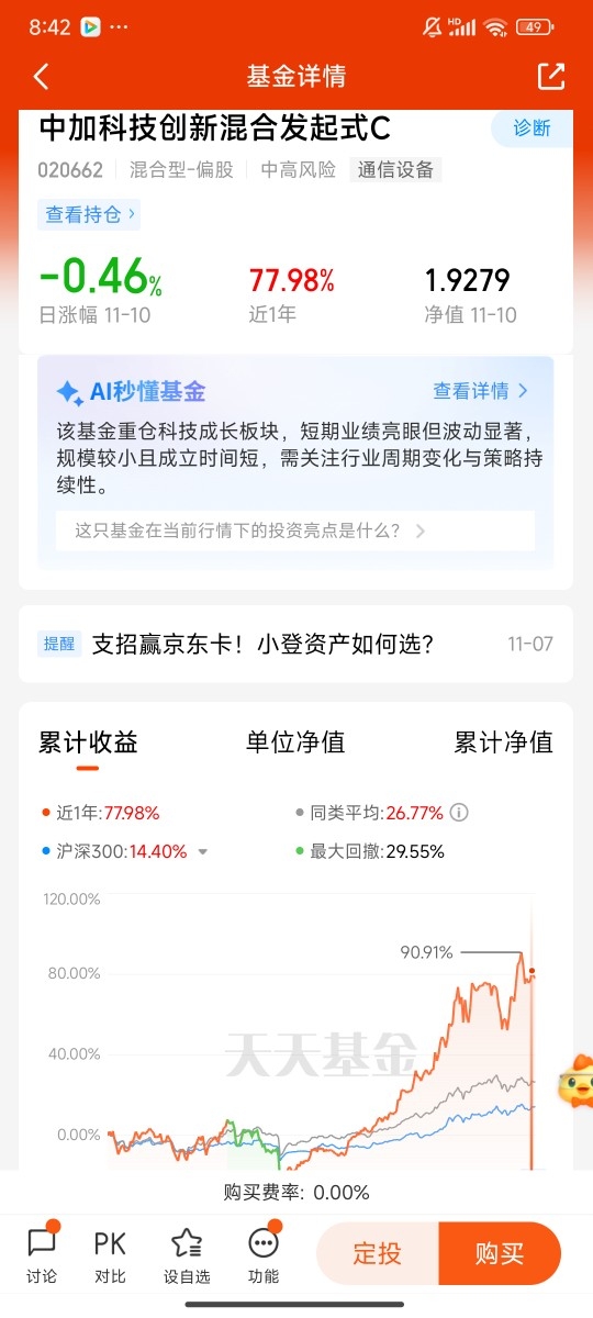 再说说中加科技创新混合发起式C。这只基金是我用来“博弹性”的配置,上周五趁下跌买入,就是看中了它在科技赛道的爆发力。它的投资方向聚焦人工智能、半导体、新能源等前沿科技领域,这些都是“小登资产”的核心赛道,长期成长逻辑清晰,政策支持力度也大。