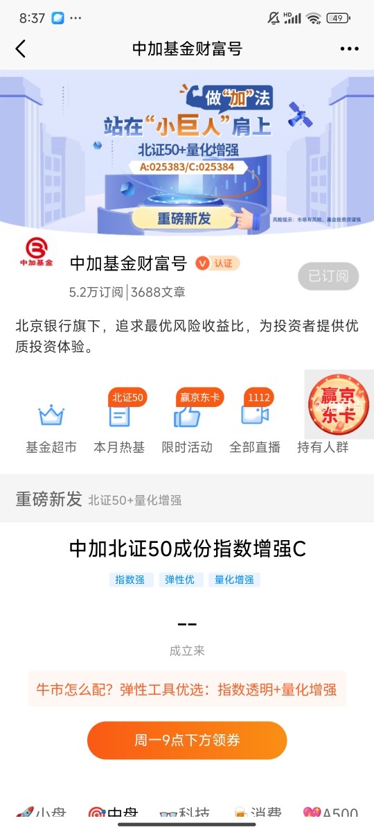 我自己就是“懒人投资党”,所以把主要精力放在了选基金上。能承受大波动、想博高收益的,中加科技创新混合发起式C(018594)和中加北证50成分指数增强C(017522)可以重点关注;像我这样风险承受能力适中,想在稳健中赚成长收益的,中加专精特新量化选股混合发起式C(018595)就是首选。上周五市场下跌时,我还趁势小买了一笔中加科技创新混合发起式C,既能摊薄成本,又能布局科技赛道的长期机会。