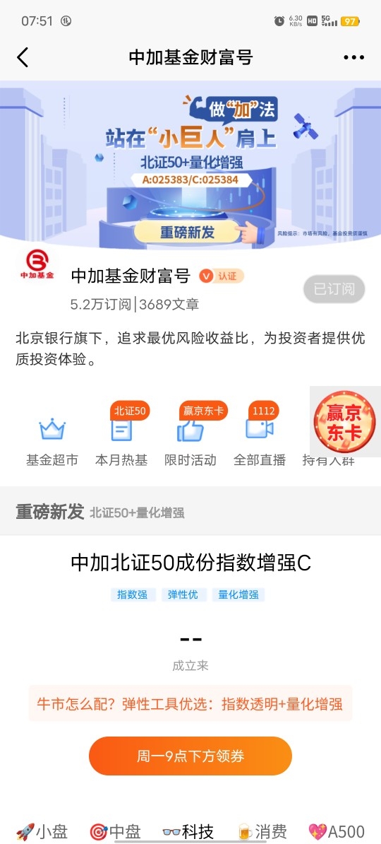 大家好,在众多基金产品中,中加专精特新量化选股混合发起式 C 有着独特的魅力与显著优势。