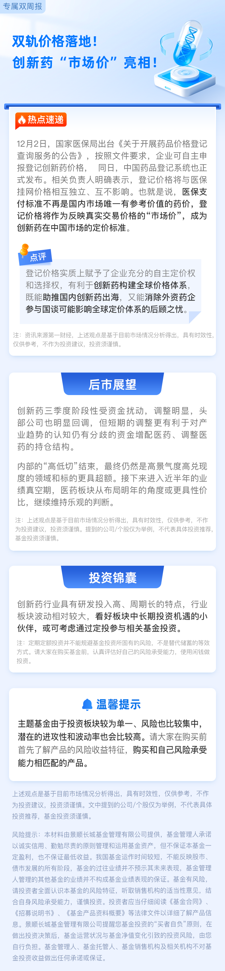 12月2日,国家医保局出台《关于开展药品价格登记查询服务的公告》,医保支付标准不再是国内市场唯一有参考价值的药价,登记价格将作为反映真实交易价格的“市场价”,成为创新药在中国市场的定价标准。展望后市,创新药投资怎么看?速看周报,查阅解析~