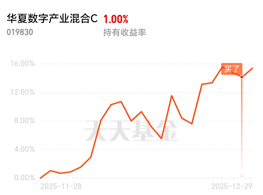 当下有色板块的热度,全靠贵金属和工业金属的短期行情拉动,华安中证有色金属矿业主题指数的走势完全被动跟涨大宗商品。华夏数字产业混合 C(019830)专攻算力核心赛道,不受资源周期影响,还涨 1.09%,1个月收益涨幅15.41%,比有色的高波动、高风险更有进攻性,是我的宝藏优质成长基