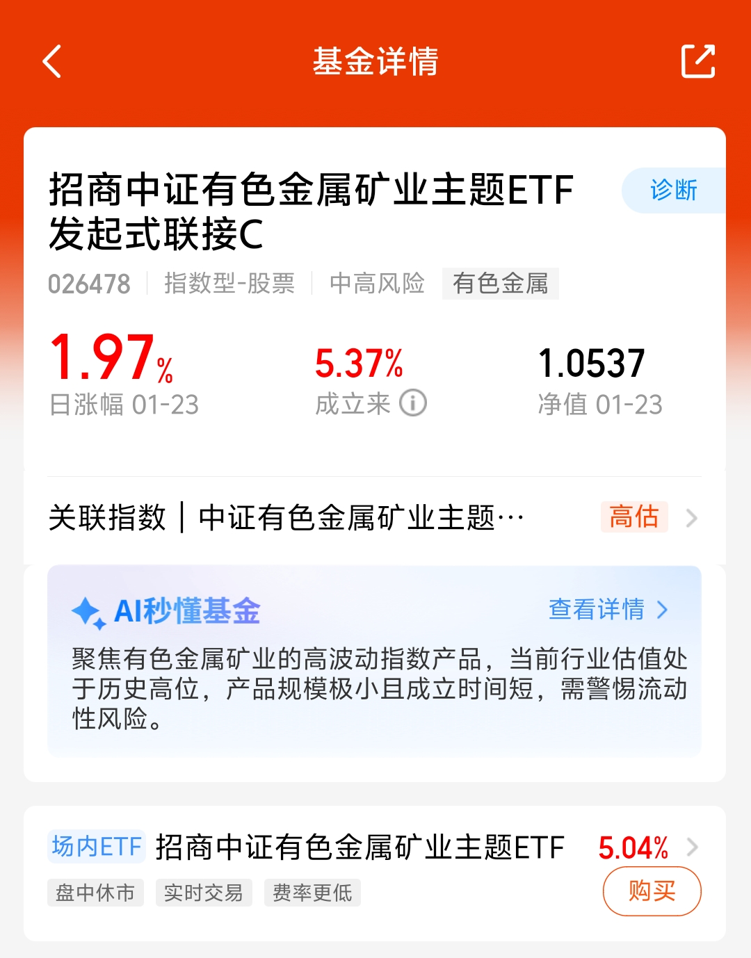 黄金白银继续创新高了,地缘政治紧张局势加剧所引发的强烈避险需求。有色金属板块今天大涨!$招商中证有色金属矿业主题ETF发起式联接C$ 今天预估涨幅超5个点,太给力了,长期看好有色金属板块,我准备继续分批布局,慢慢积累筹码了!#金价突破5000美元!机构猛吹#