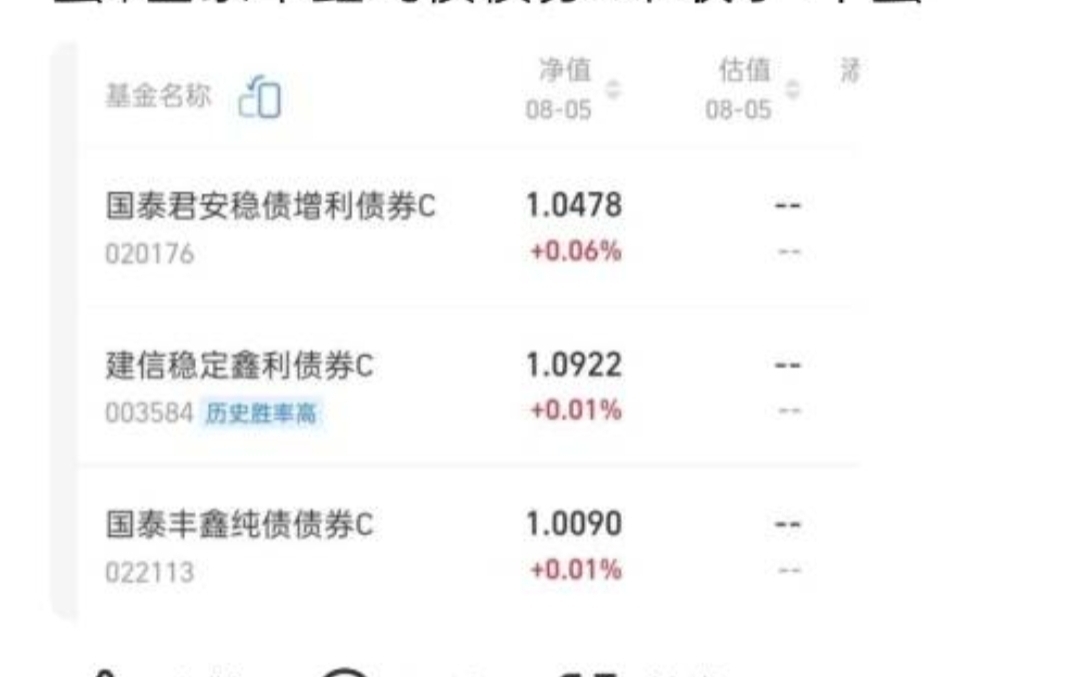 基金市场的即时动态已实时更新,不同基金的净值有涨有落,各板块的表现分化仍然明显。想搞清楚哪些基金当下势头强劲、哪些暂时进展平缓?接着往下浏览,这些信息就能轻松了解到啦!$国泰君安稳债增利债券发起C$ 收了6个蛋$建信稳定鑫利债券C$ 收了1个蛋$国泰丰鑫纯债债券C$ 收了1个蛋