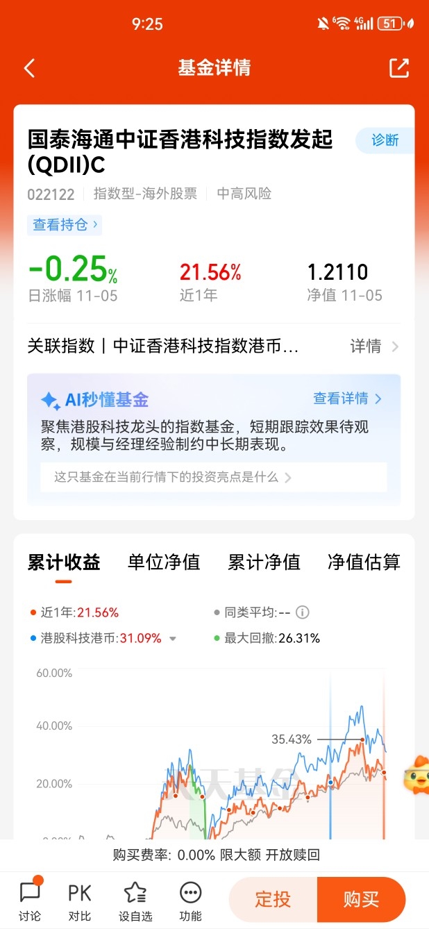 #四季度看好科技吗# $国泰海通中证香港科技指数发起(QDII)C$ 今年初入的国泰海通中证香港科技指数C(022122),现在打开持仓一看,近一年赚了21个点,比之前买的理财香到不知道哪去了~