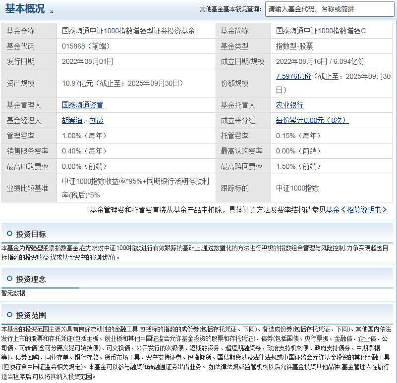 基金经理的投资能力和经验对基金的表现至关重要。国泰海通中证1000指数增强C的基金经理有着丰富的投资经验和专业的投资能力,能够运用数量化的方法进行投资组合管理和风险控制。他们会根据市场情况和指数成分股的变化,及时调整投资策略,以实现基金的投资目标。就像一位经验丰富的船长,能够在复杂的市场海洋中掌舵前行,为投资者带来稳定的收益。