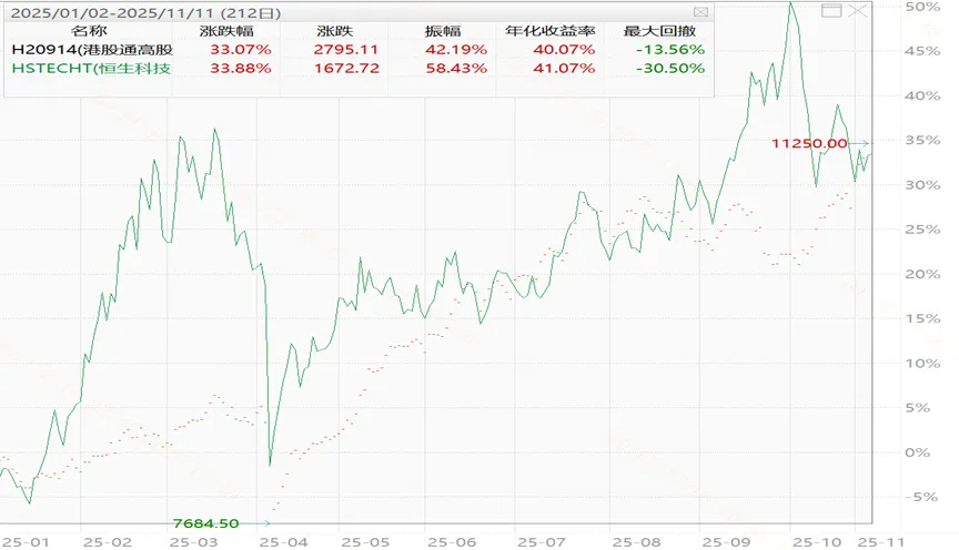 2、今年以来,截至2025年11月11日,港股恒生科技总回报指数今年以来累计涨幅33.88%,然而,令人意外的是,被视为“防守型”的港股红利资产在今日跑赢“进攻旗帜”恒生科技。并且,港股通高股息最大回撤仅13.56%,而同期恒生科技指数最大回撤高达30.5%(数据来源:wind)。