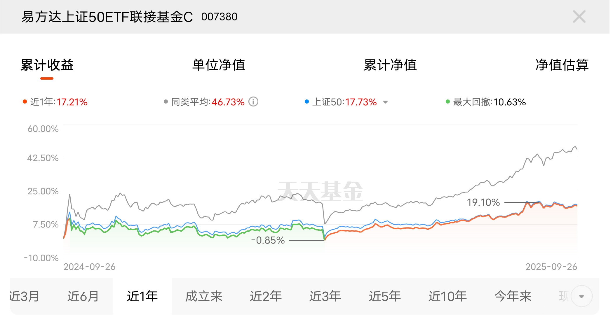 成长股这会儿势头很猛,但估值往上走,风险得留意,别追高。配些大盘价值平衡持仓,易方达上证50ETF联接C近1年17.21%,收益稳,持仓靠谱。