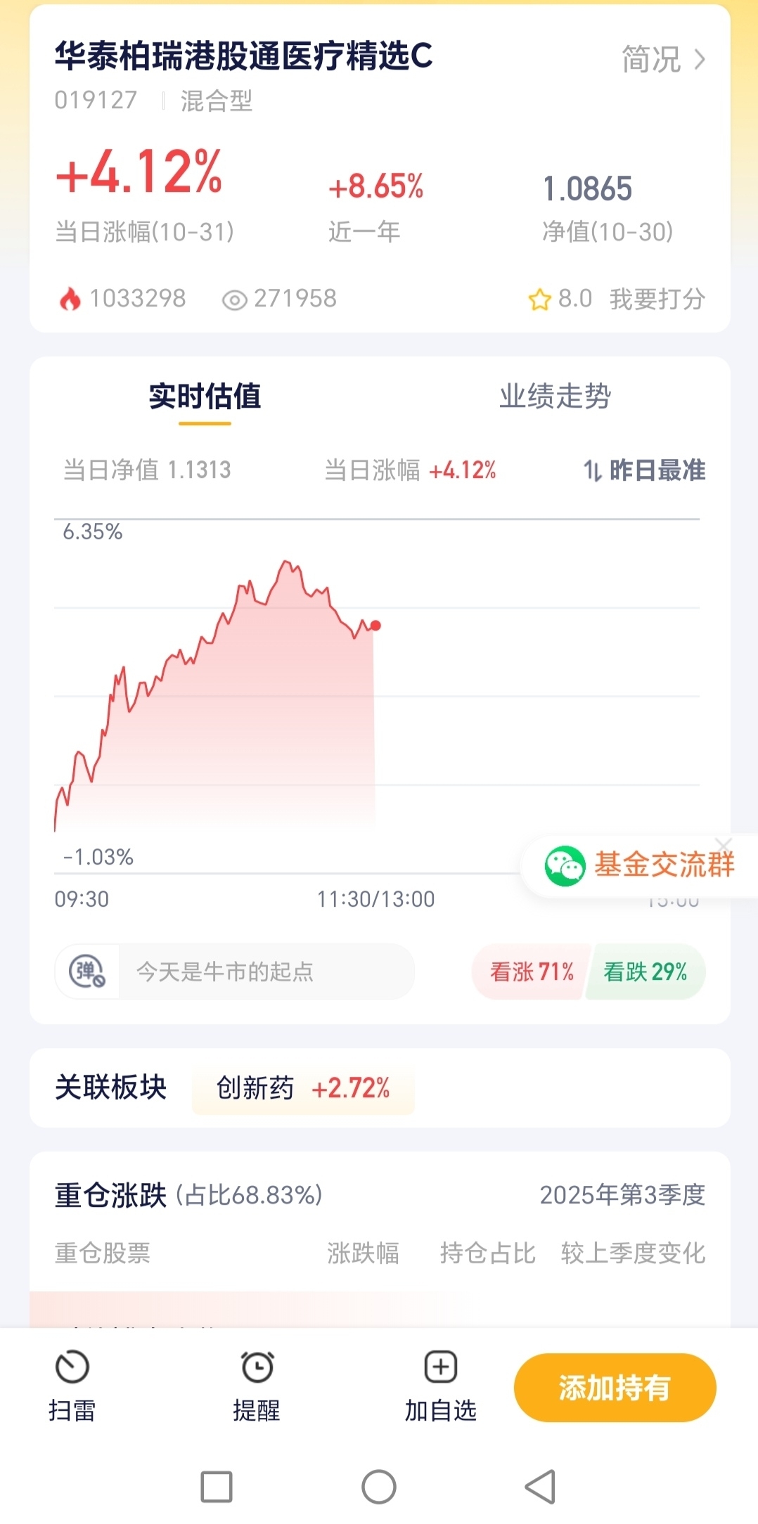 创新药今天涨得不错,华泰柏瑞也涨了4.12%,近一年涨幅8.65%。要是你觉得医疗行业未来有发展,想投点港股医疗的基金,华泰柏瑞这只可以了解下,趁着行情好,说不定能跟着赚点小钱。#美联储再次降息!12月降息与否难料#