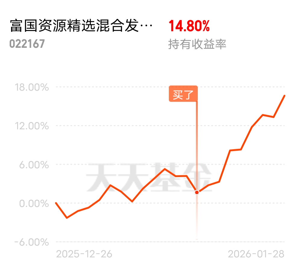 今天市场走势延续分化震荡,指数涨跌不一,行情赛道分化,不过大宗商品走势依旧坚挺。我持仓的$富国资源精选混合发起式C$ (022167)昨天上涨2.92%,现在估值上涨1.66%,我现在的持仓收益都有14.8%了,业绩表现是很不错的,这只基金紧扣资源核心主线,重点布局锂等优质资源标的,精准踩中新能源需求风口。叠加全球降息周期开启,流动性宽松利好大宗商品估值修复,资源板块景气度持续抬升。看走势,近期很明显进入了上涨行情,拉升速度才那么快,现在市场维持慢牛行情,讲究强者恒强趋势,目前来看富国资源精选混合C还有希望继续盈利吃肉,我今天继续持仓等涨。