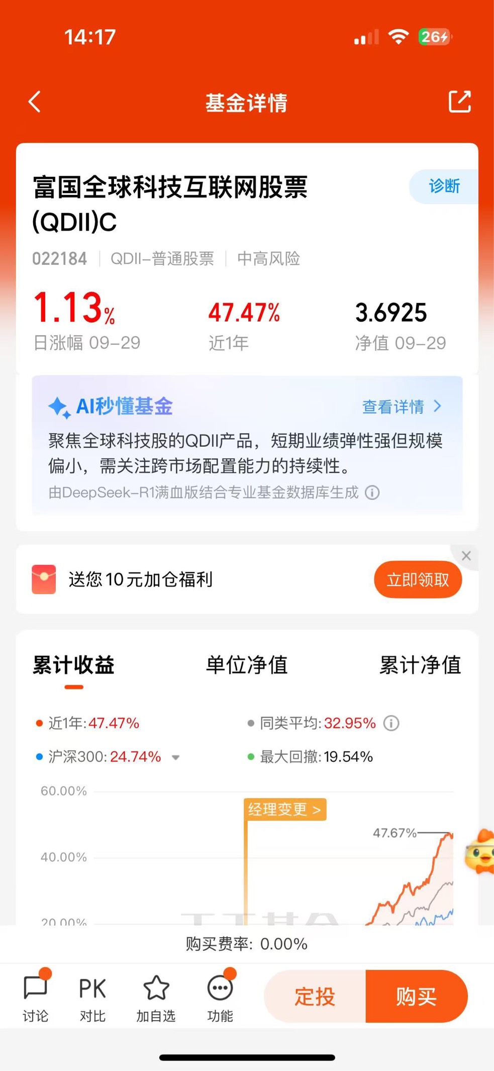 富国全球科技互联网配置全球科技互联网,业绩上突出波动不大,适合长期持有$富国全球