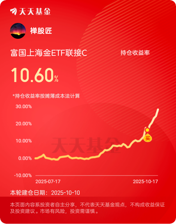 最近我投资运气还不错,国庆后入手的富国上海金ETF联接C(009505),收益都超过10%啦。这让我对接下来的投资信心满满,打算择机加配富国全球科技互联网(022184),手里有筹码,心里自然稳稳当当不慌张啦!$富国上海金ETF联接C(OTCFUND|009505)$