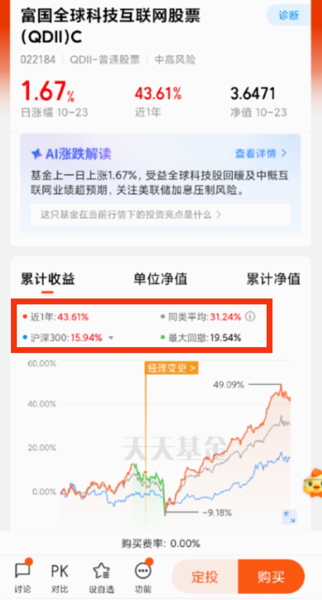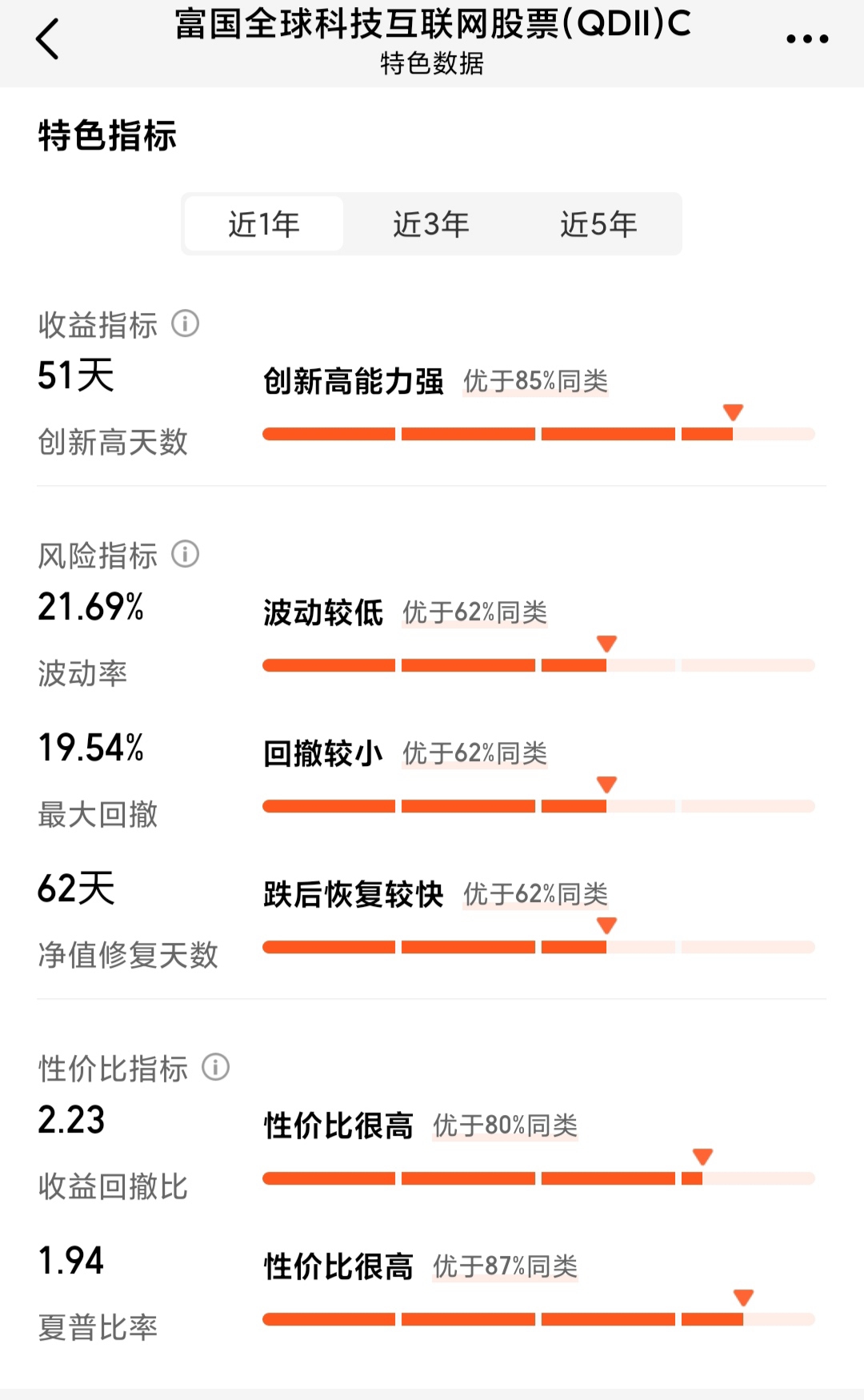 并且相对于单一市场而言,这种跨市场的基金在一定程度上帮助我们分散单一市场的风险。当某个市场表现不佳时,其他市场的优质资产可能形成互补。这一点主要体现在回撤上,该基金近一年最大回撤仅为19.54%,要明显小于同类的科技基金,跌后修复也非常快,投资性价比比较高。