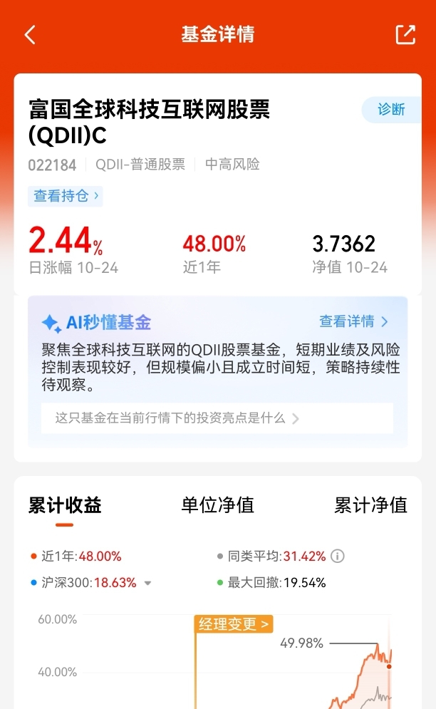 不得不服,美股科技行情是真的好,又大涨了,今天看$富国全球科技互联网股票(QDII)C$ 这只基大涨2.44%,近一年大涨48%。而且美股科技大多限购,这次发现的这只基金持仓主要是全球科技互联网,不限购,规模小,业绩好,很抗回撤,真的不错