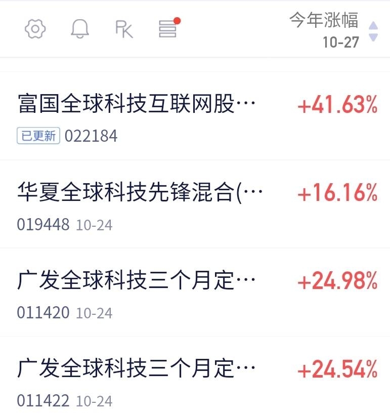 $广发全球科技三个月定开混合(QDII)人民币A$ 今年涨24.98%