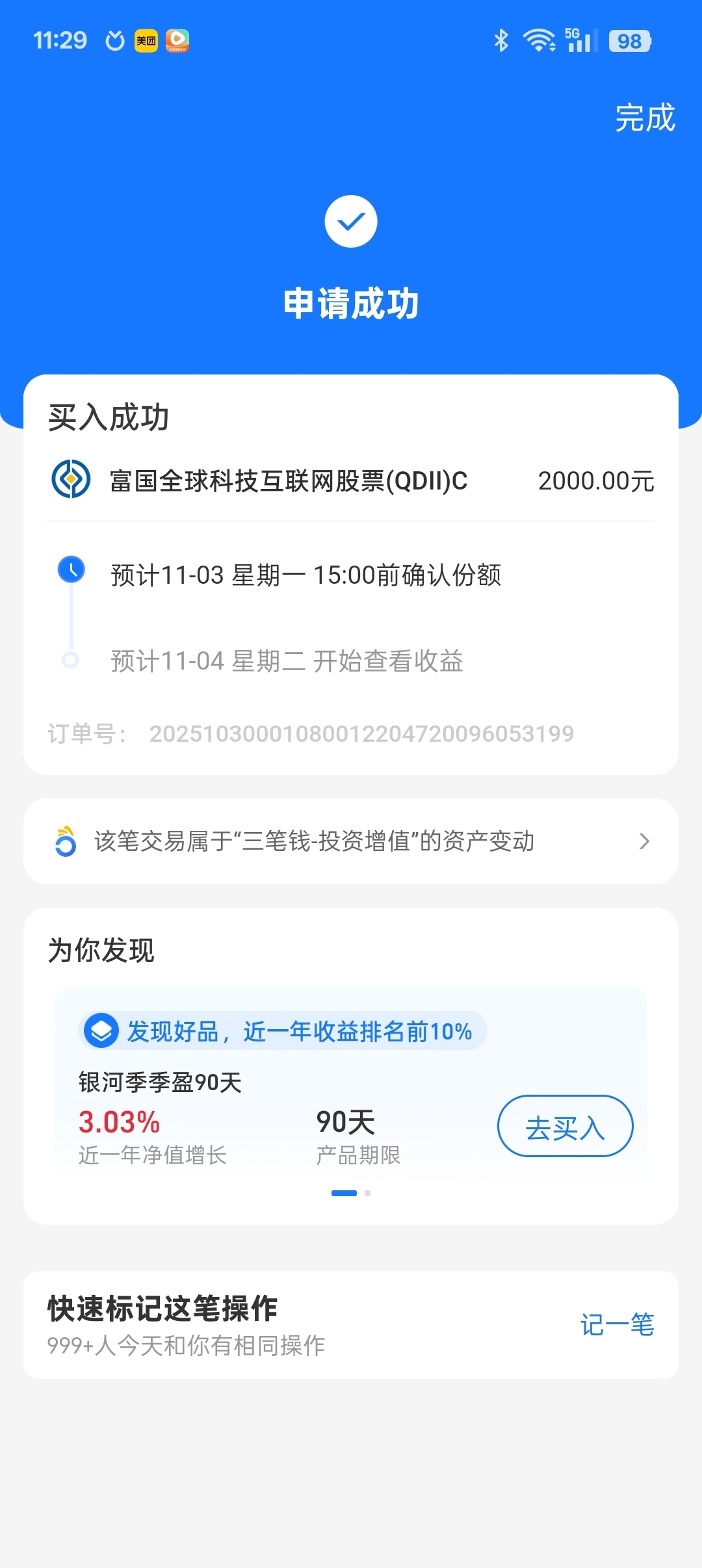 美股近期表现还行,美股科技企业强强联合,微软与甲骨文合作提升供应链效率,与英国AI公司Nscale签订高达140亿美元的合作,谷歌与Anthropic签订数百亿美元的AI算力订单,今天买入2000$富国全球科技互联网股票(QDII)C$  这个产品投资广而且持仓组合完美契合当前半导体、AI全产业链的高景气趋势,受利多,近一个月涨幅4.22%近三个月涨幅20.17%表现不错啊,随着全球经济数字化进程加速和AI产业化应用落地,这个产品有望继续受益于科技行业的长期成长趋势。